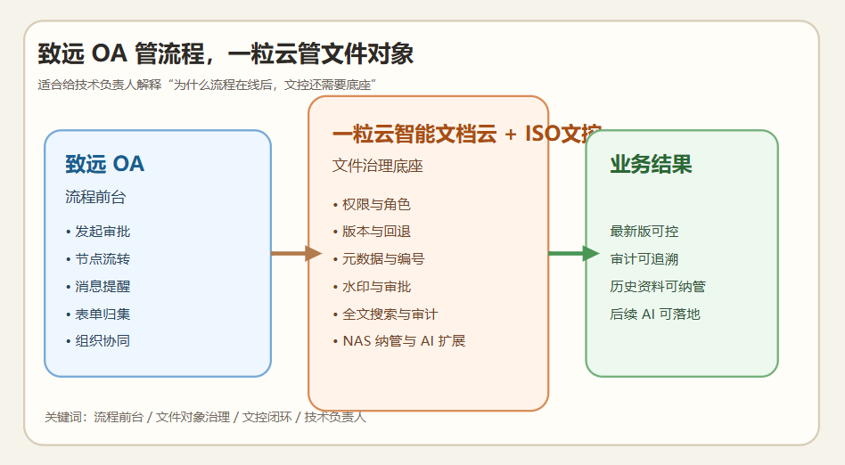 而“致远 OA + 一粒云智能文档云 + ISO 文控”这套组合的价值,恰恰就在这里: