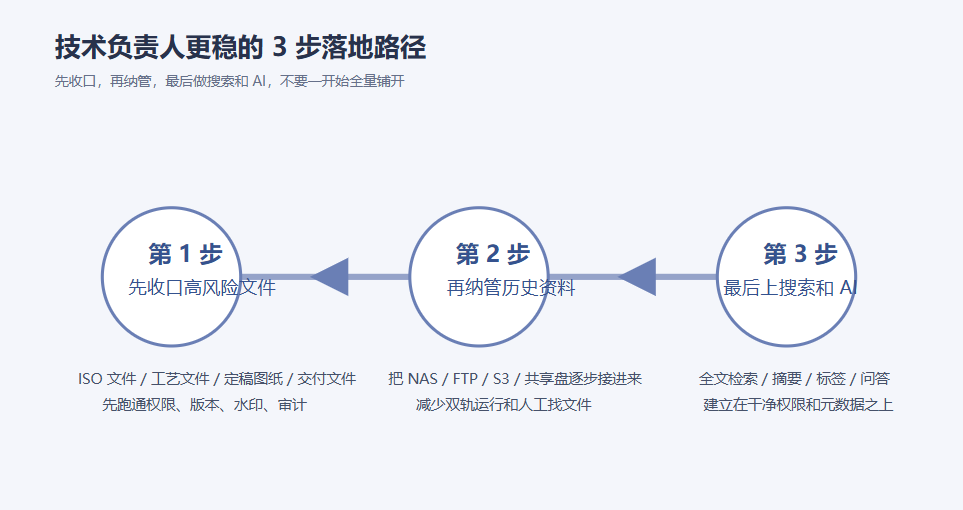 第三步,最后再上搜索和 AI。 等元数据、编号、权限、历史版本都稳定下来,再启用全文搜索、摘要、标签、知识问答。